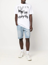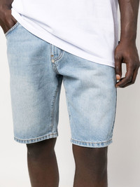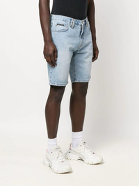 knee-length denim shorts knee-length denim shorts from PHILIPP PLEIN featuring light blue, logo patch to the rear, belt loops, concealed front fastening, classic five pockets and knee-length. Imported Composition Lining: Polyester 65%, Cotton 35% Outer: Cotton 100% Washing instructions Hand Wash