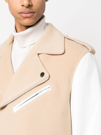 leather biker jacket Highlights - White/beige - Calf leather - Contrasting-fabric sleeves - Decorative button flap - Notched lapels - Off-centre front zip fastening - Long sleeves - Two side zip-fastening pockets - Zip-fastening chest pocket - Ribbed cuffs Imported Composition Outer: Fabric 60%, Calf Leather 40% Lining: Polyester 100% SIZE & FIT Model measurements Height 6 ft 2 in(1.87 m) Bust/Chest 38.18 in(97 cm) Hips 36.61 in(93 cm) Waist 29.13 in(74 cm) FittingInformation Designed to be unstructured, offering a loose fit throughout Washing instructions Specialist Cleaning
