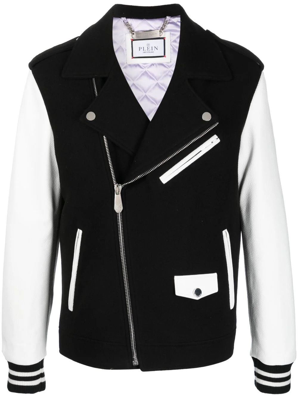 leather biker jacket Highlights - Black/white - Calf leather - Contrasting-fabric sleeves - Decorative button flap - Notched lapels - Off-centre front zip fastening - Long sleeves - Two side zip-fastening pockets - Zip-fastening chest pocket - Ribbed cuffs Imported Composition Outer: Fabric 60%, Calf Leather 40% Lining: Polyester 100% SIZE & FIT Model measurements Height 6 ft 2 in(1.87 m) Bust/Chest 38.18 in(97 cm) Hips 36.61 in(93 cm) Waist 29.13 in(74 cm) FittingInformation Designed to be unstructured, offering a loose fit throughout Made from a midweight non-stretch fabric This piece fits true to size – take your usual size Washing instructions Specialist Cleaning