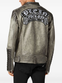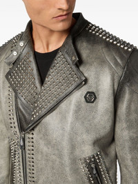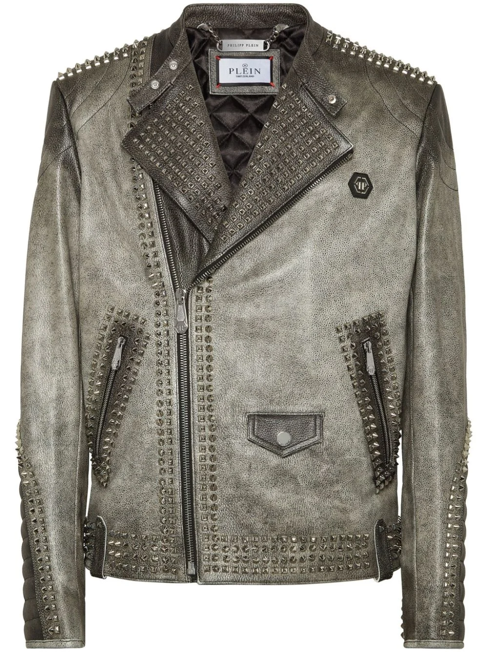 leather biker jacket Highlights - Black - Calf leather - Off-centre front zip fastening - Faded effect - Spike stud detailing - Silver-tone rockstud detailing - Notched collar - Applique logo - Two side zip-fastening pockets - Long sleeves - Logo patch to the rear - Straight hem Imported Composition Lining: Polyester 100% Outer: Calf Leather 100%, Acrylonitrile Butadiene Styrene (ABS) 100%