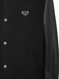 leather sleeves hooded bomber jacket Highlights - Black - Press-stud fastening - Classic hood - Leather sleeves - Long sleeves - Logo patch at the chest - Two side welt pockets - Ribbed cuffs and hem Imported Composition Outer: Leather 100%, Polyester 64%, Viscose 33%, Spandex/Elastane 3% Lining: Polyester 100%