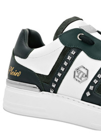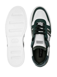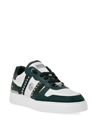 logo-embellished panelled sneakers Highlights - White and dark green - Studded detailing - Logo embroidery - Cushioned sole - Perforated toebox - Front lace-up fastening Made in Italy Composition Outer: Calf Leather 100%, Bovine Split Leather 100%, Zamak 100%, Acrylonitrile Butadiene Styrene (ABS) 100% Lining: Calf Leather 100% Sole: Rubber 100%