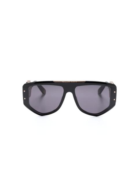 logo-embossed rectangle-frame sunglasses Highlights - Black - Acetate - Rectangle frame - Blue tinted lenses - Embossed logo to the side - Sculpted arms - Uv protection - These glasses come with a protective case. Made in Italy Composition Acetate 100% SIZE & FIT Measurement Arm Length 5.7 in(14.5 cm) Bridge Width 0.7 in(1.8 cm) Lens Diameter 2.12 in(5.4 cm) Total Width 5.9 in(15 cm)