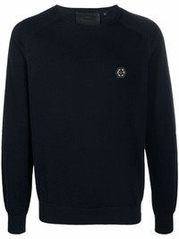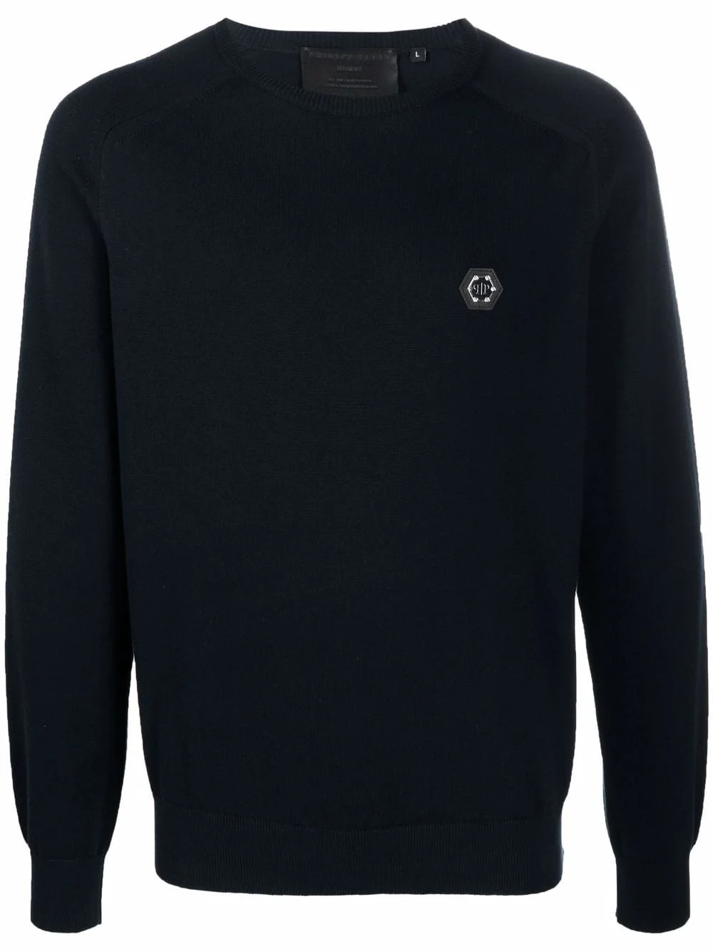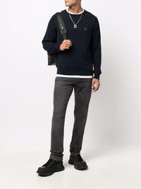 logo-patch crew neck jumper navy-blue cotton fine knit crew neck long sleeves ribbed hem Imported Composition Cotton 100% SIZE & FIT Model measurements Height 6 ft 1 in(1.85 m) Bust/Chest 37.79 in(96 cm) Hips 37.4 in(95 cm) Waist 30.7 in(78 cm) FittingInformation This piece fits true to size. We recommend you get your regular size Cut for a relaxed fit Made with a mid-weight fabric Washing instructions Hand Wash