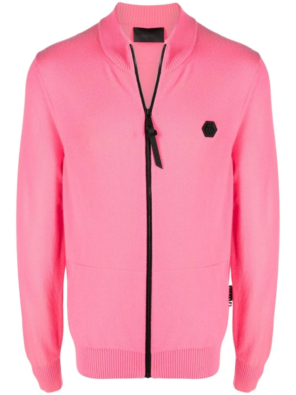 logo-patch zip-up cardigan Philipp Plein revamps the classic zip-up cardigan with a bright pink colourway and branded signature details. With a contrasting front zip, this knitted piece is embellished with a tonal embroidered Skull motif to the rear and a signature logo patch on the chest. Made in Italy Composition Cashmere 100% SIZE & FIT Model measurements Height 6 ft 2 in(1.88 m) Bust/Chest 37.79 in(96 cm) Hips 38.58 in(98 cm) Waist 29.52 in(75 cm) FittingInformation This piece fits true to size. We recommend you get your regular size Cut for a relaxed fit Made with a mid-weight fabric Washing instructions Dry Clean Only