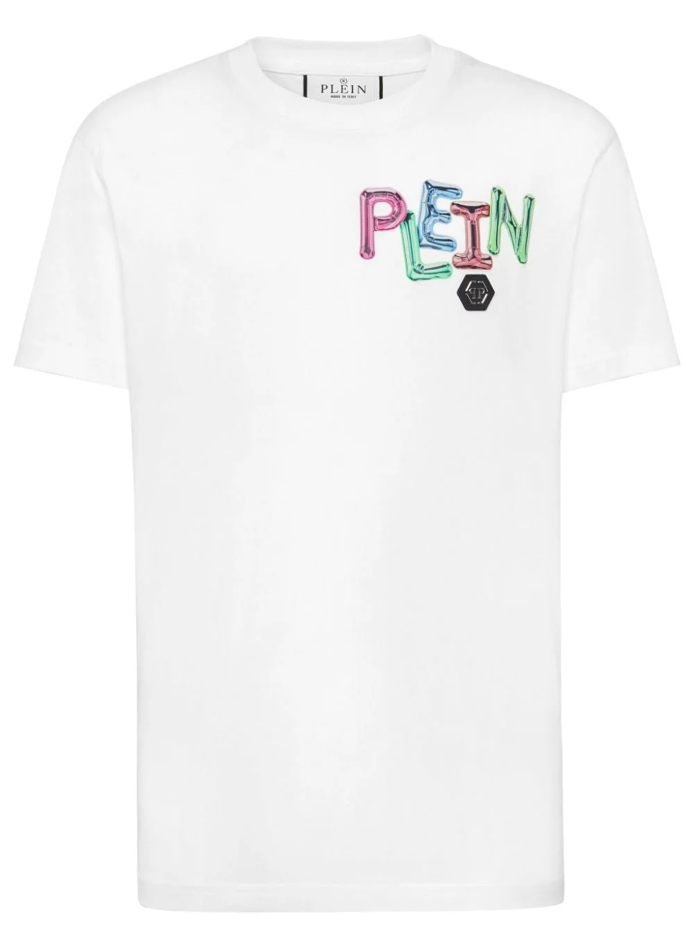 logo-print cotton T-shirt Philipp Plein infuses signature flamboyance into a wardrobe staple with this white T-shirt. Cut from cotton jersey to a minimalist short-sleeve silhouette, it is emblazoned with a colourful balloon logo print, with a skeleton holding the inflated lettering to the rear. Highlights - White - Cotton - Jersey texture - Logo print at the chest - Logo print to the rear - Skeleton print - Applique logo - Round neck - Short sleeves - Straight hem Made in Italy Composition Cotton 100% Washing instructions Read Manufacturer Guidelines