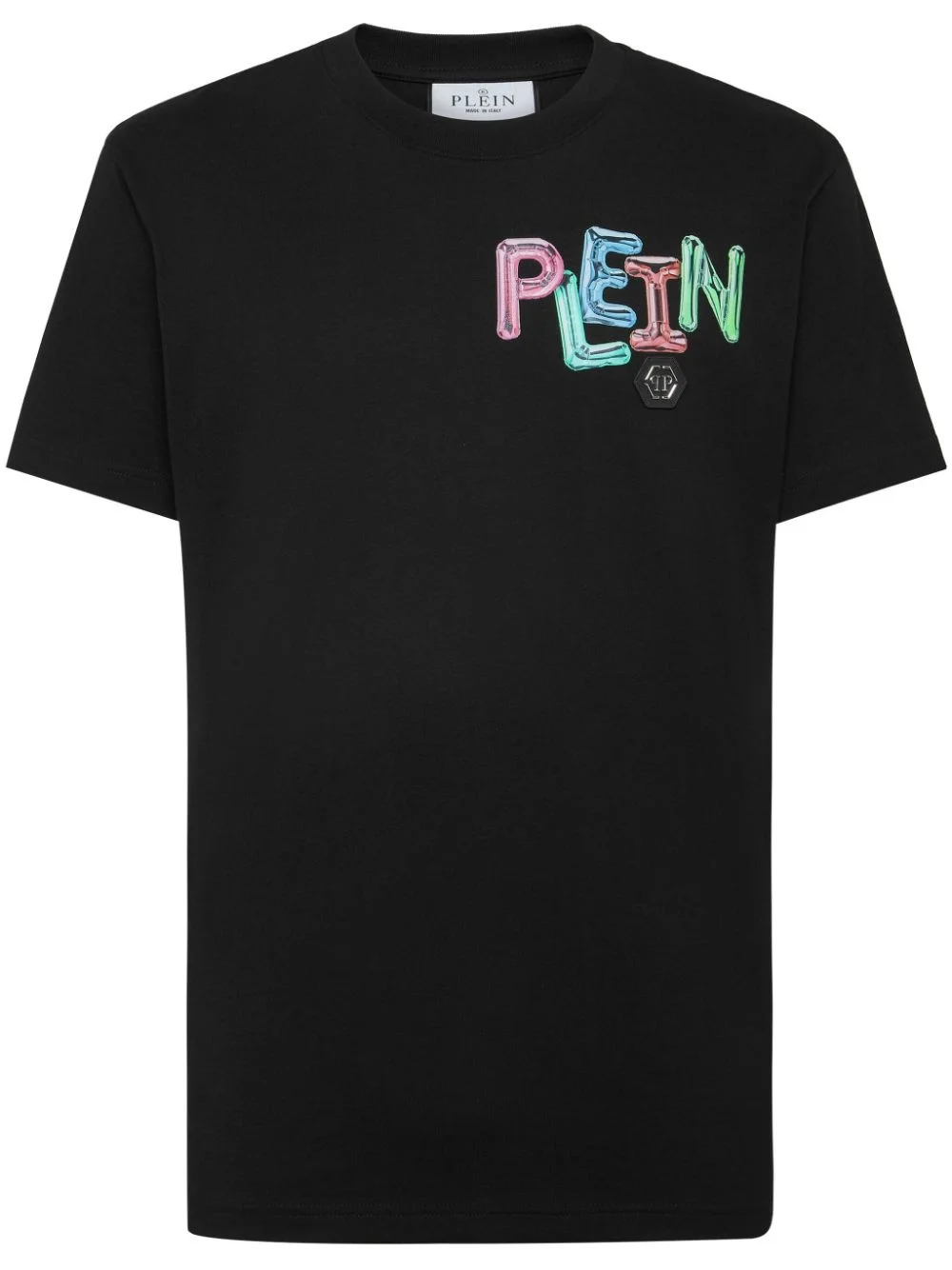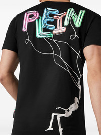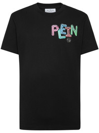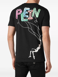 logo-print cotton T-shirt Philipp Plein infuses signature flamboyance into a wardrobe staple with this black T-shirt. Cut from cotton jersey to a minimalist short-sleeve silhouette, it is emblazoned with a colourful balloon logo print, with a skeleton holding the inflated lettering to the rear. Highlights - Black - Cotton - Jersey texture - Logo print at the chest - Logo print to the rear - Skeleton print - Applique logo - Round neck - Short sleeves - Straight hem Made in Italy Composition Cotton 100% Washing instructions Read Manufacturer Guidelines