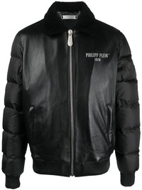 logo-print padded leather jacket black/white lambskin padded design logo print to the front contrasting-fabric sleeves front zip fastening long sleeves Imported Composition Outer: Polyester 100%, Lamb Skin 100% Lining: Polyester 100%, Sheep Skin/Shearling 100%, Goose Down 90%, Feather Down 10% SIZE & FIT Model measurements Height 6 ft 2 in(1.87 m) Bust/Chest 36.41 in(92.5 cm) Hips 37 in(94 cm) Waist 29.52 in(75 cm) FittingInformation This piece fits true to size. We recommend you get your regular size Cut for a slim fit Made with a mid-weight non-stretch fabric Washing instructions Specialist Cleaning