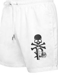 logo-print swim shorts Highlights - White/black - Logo print to the side - Drawstring fastening waist - Mid-rise - Slip pockets to the sides - Applique logo - Thigh-length - Be mindful to try on swimwear over your own garments. Imported Composition Polyester 100%