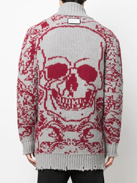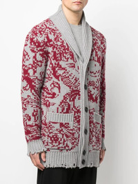 long intarsia-knit cardigan ash grey blood red ribbed detailing intarsia knit V-neck front button fastening long sleeves two front patch pockets Made in Italy Composition Outer: Lambs Wool 100% SIZE & FIT Model measurements Height 6 ft 3 in(1.9 m) Bust/Chest 38.18 in(97 cm) Hips 37.79 in(96 cm) Waist 32.67 in(83 cm) FittingInformation Designed for an oversized fit, offering additional room throughout Made with a heavyweight knit, this piece offers some stretch This piece fits true to size – take your usual size Washing instructions Dry Clean Only