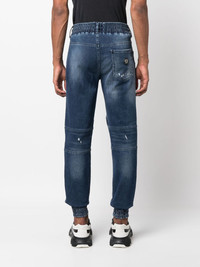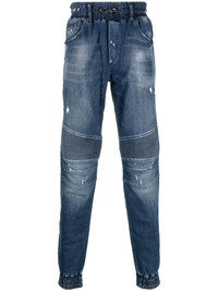mid-rise tapered-leg jeans Highlights - Indigo blue - Cotton blend - Denim - Ribbed detailing - Ripped detailing - Stonewashed - Drawstring fastening waist - Classic five pockets - Elasticated ankles - Mid-rise - Tapered leg - Straight hem Imported Composition Outer: Cotton 98%, Elastane 2% Lining: Polyester 65%, Cotton 35% SIZE & FIT Model measurements Height 6 ft 2 in(1.87 m) Bust/Chest 36.22 in(92 cm) Hips 37 in(94 cm) Waist 27.95 in(71 cm) FittingInformation Designed for a slim tapered leg, these jeans offer a close fit that sits just away from the leg with a closer fit towards the ankle The elasticated waist allows for a comfortable fit Constructed from stretch denim, this piece offers a stretch fit with durability This piece fits true to size – take your usual size