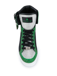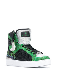 Money Beast high-top sneakers Highlights - Green/black/white - Leather - Flame print - Logo patch at the tongue - Crystal embellishments - Round toe - Front lace-up fastening - Ankle-length - Rubber sole Made in Italy Composition Outer: Leather 100%, PVC 100% Lining: Leather 100% Sole: Rubber 100% SIZE & FIT Measurement HEEL 1.77 in(4.5 cm) HEIGHT 5.51 in(14 cm) Sole height 1.18 in(3 cm)
