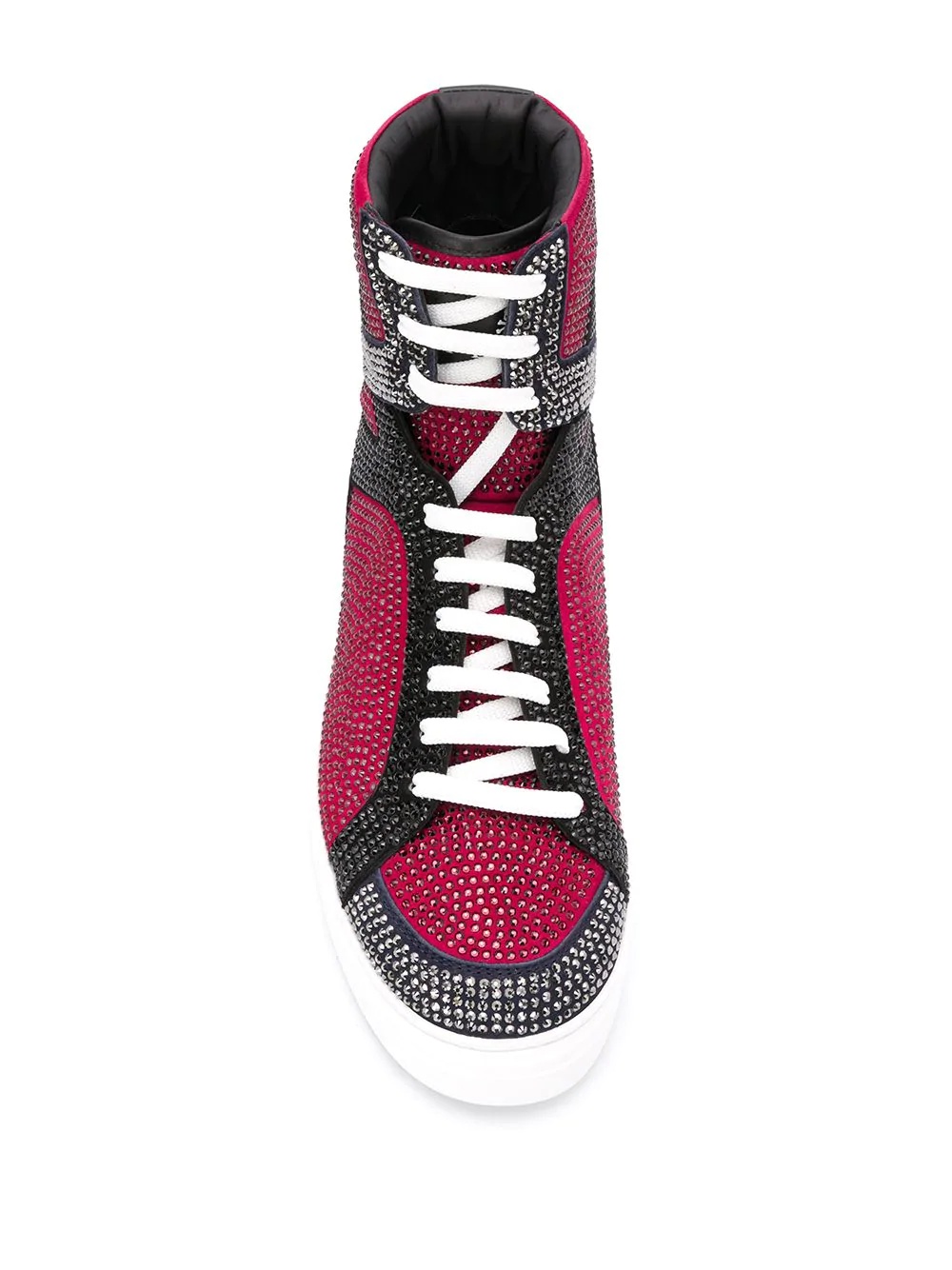 Money Beast high-top sneakers Black and dark red leather Money Beast high-top sneakers from Philipp Plein featuring crystal embellishments, a round toe, a lace fastening, an ankle length and a white rubber sole. Composition Sole: Rubber 100% Outer: Calf Leather 100%, Goat Skin 100%, Glass 100% Lining: Calf Leather 100% SIZE & FIT Measurement HEEL 1.8 in(4.5 cm) HEIGHT 5.5 in(14 cm) Sole height 1.2 in(3 cm)