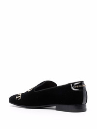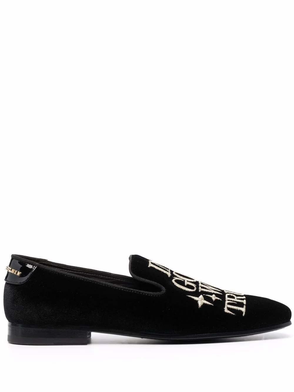 Money-embroidered velvet loafers black leather square toe slip-on style branded insole flat sole Made In Italy Composition Outer: Fabric 100% Lining: Sheepskin 100% Sole: Synthetic Rubber 100% SIZE & FIT Measurement HEEL 0.78 in(2 cm)