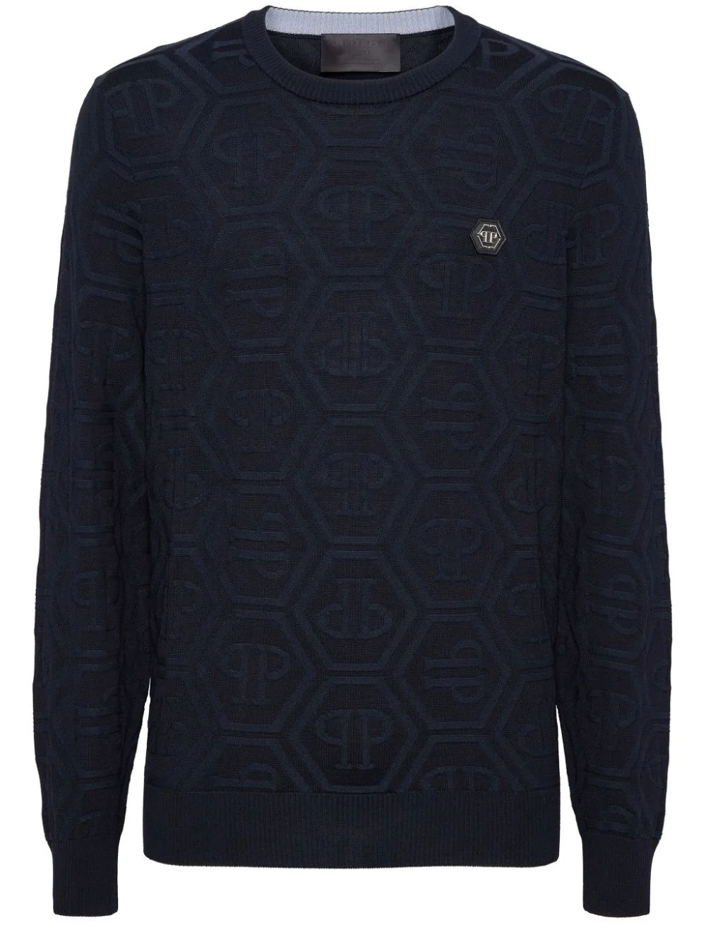 monogram-jacquard sweater Highlights - Navy blue - Crew neck - Long sleeves - Ribbed cuffs and hem - Applique logo Made in Italy Composition Merino 50%, Silk 50%