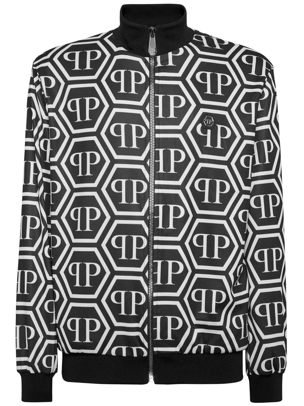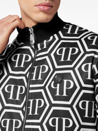monogram-print track jacket Philipp Plein's boldly branded aesthetic is on full display with this track jacket. It is presented in a two-tone colourway and defined by an all-over monogram pattern. Highlights - Black/white - High neck - Monogram pattern - Logo patches to the front - Front zip fastening - Long sleeves - Straight hem Imported Composition Polyester 100%