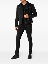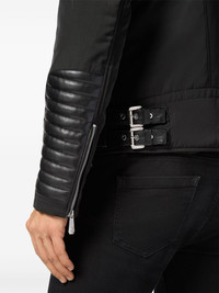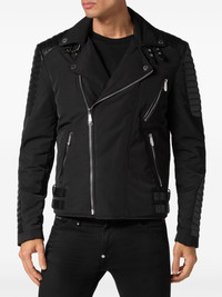 padded-detail leather biker jacket Philipp Plein adds his signature spin to this jacket. The leather construction and biker silhouette contribute to its hard-edged aesthetic. Highlights - Black - Leather - Padded panels - Silver-tone hardware - Notched lapels - Off-centre front fastening - Two side zip-fastening pockets - Long sleeves - Straight hem Imported Composition Nylon 100%, Leather 100%