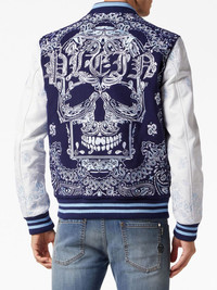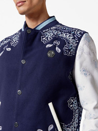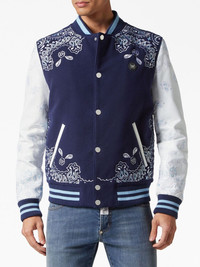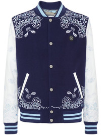 paisley-print bomber jacket Highlights - Blue/white - Paisley print - Front button fastening - Slip pocket to the front - Ribbed band collar - Long sleeves - Ribbed cuffs and hem Imported Composition Polyester 60%, Lambskin 40% SIZE & FIT FittingInformation Designed to be unstructured, offering a loose fit throughout The ribbed hem offers a close, comfortable fit Made from a midweight fabric