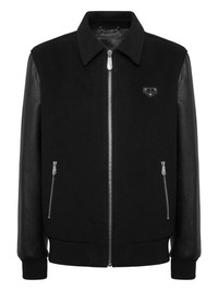 panelled bomber jacket Highlights - Black - Long sleeves - Spread collar - Zip fastening - Side pockets - Logo patch at the chest Imported Composition Outer: Lamb Skin 100%, Polyester 64%, Viscose 33%, Spandex/Elastane 3% Lining: Polyester 100%