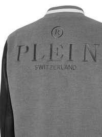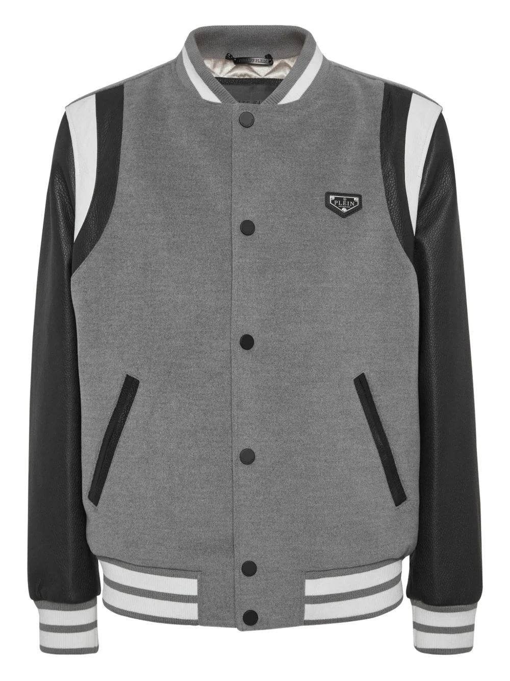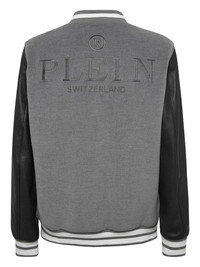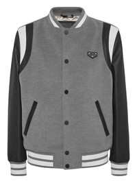 panelled bomber jacket Highlights - Grey - Contrast sleeves - Embroidered logo detailing - Press-stud fastening - Ribbed cuffs and hem - Quilted lining Imported Composition Outer: Lamb Skin 100%, Polyester 64%, Viscose 33%, Spandex/Elastane 3% Lining: Polyester 100% Washing instructions Read Manufacturer Guidelines