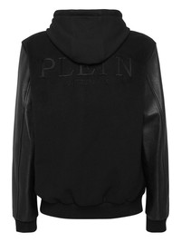 panelled hooded jacket Highlights - Black - Press-stud fastening - Embroidered logo detailing - Two side pockets - Ribbed cuffs and hem Imported Composition Lining: Polyester 100% Outer: Lamb Skin 100%, Polyester 64%, Viscose 33%, Spandex/Elastane 3% Washing instructions Read Manufacturer Guidelines