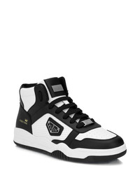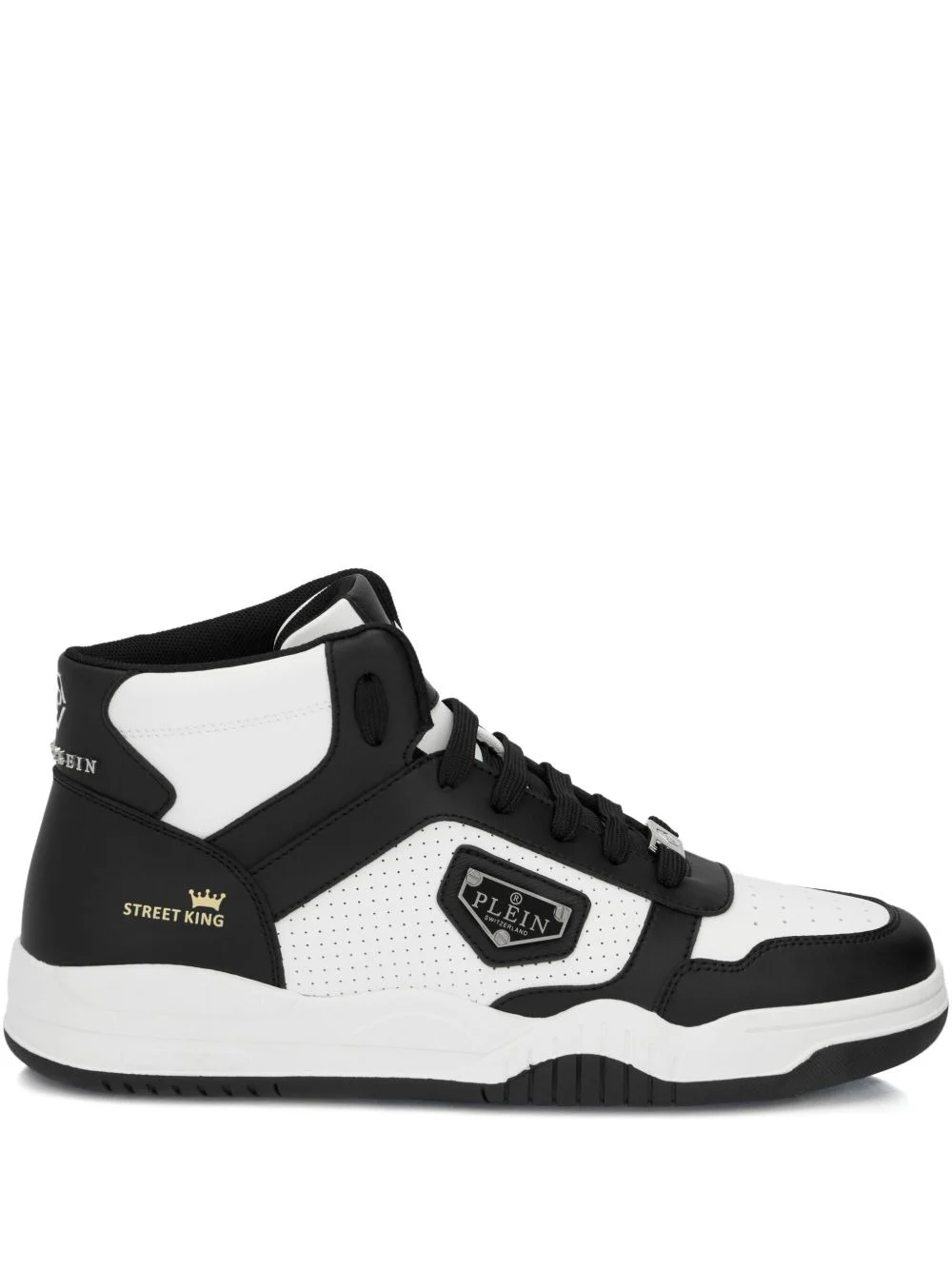 perforated logo mid-top trainers Highlights - White and black - Perforated detailing - Logo plaque - Front lace-up fastening - Mid-top style Imported Composition Outer: Bovine Leather 100% Lining: Polyester 100% Sole: Rubber 100%
