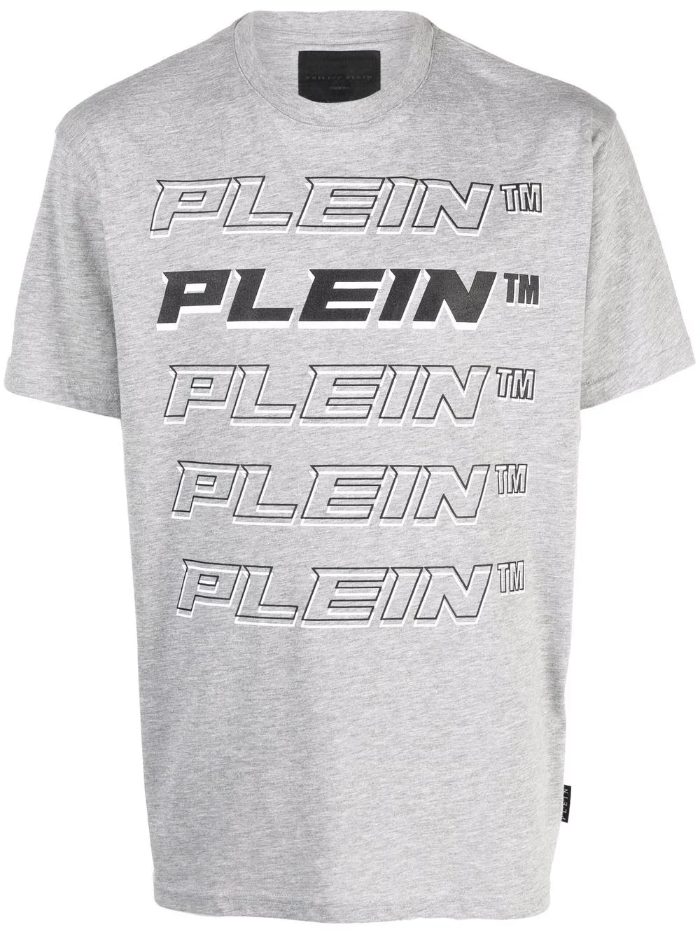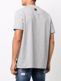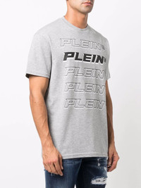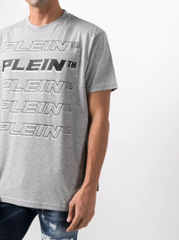 Plein repeat logo T-shirt grey cotton blend logo print to the front logo patch to the rear round neck short sleeves straight hem Imported Composition Polyester 70%, Cotton 30% SIZE & FIT Model measurements Height 6 ft 1 in(1.85 m) Bust/Chest 37.79 in(96 cm) Hips 37.4 in(95 cm) Waist 30.7 in(78 cm) FittingInformation This piece fits true to size. We recommend you get your regular size Cut for a relaxed fit Made with a mid-weight fabric Washing instructions Hand Wash