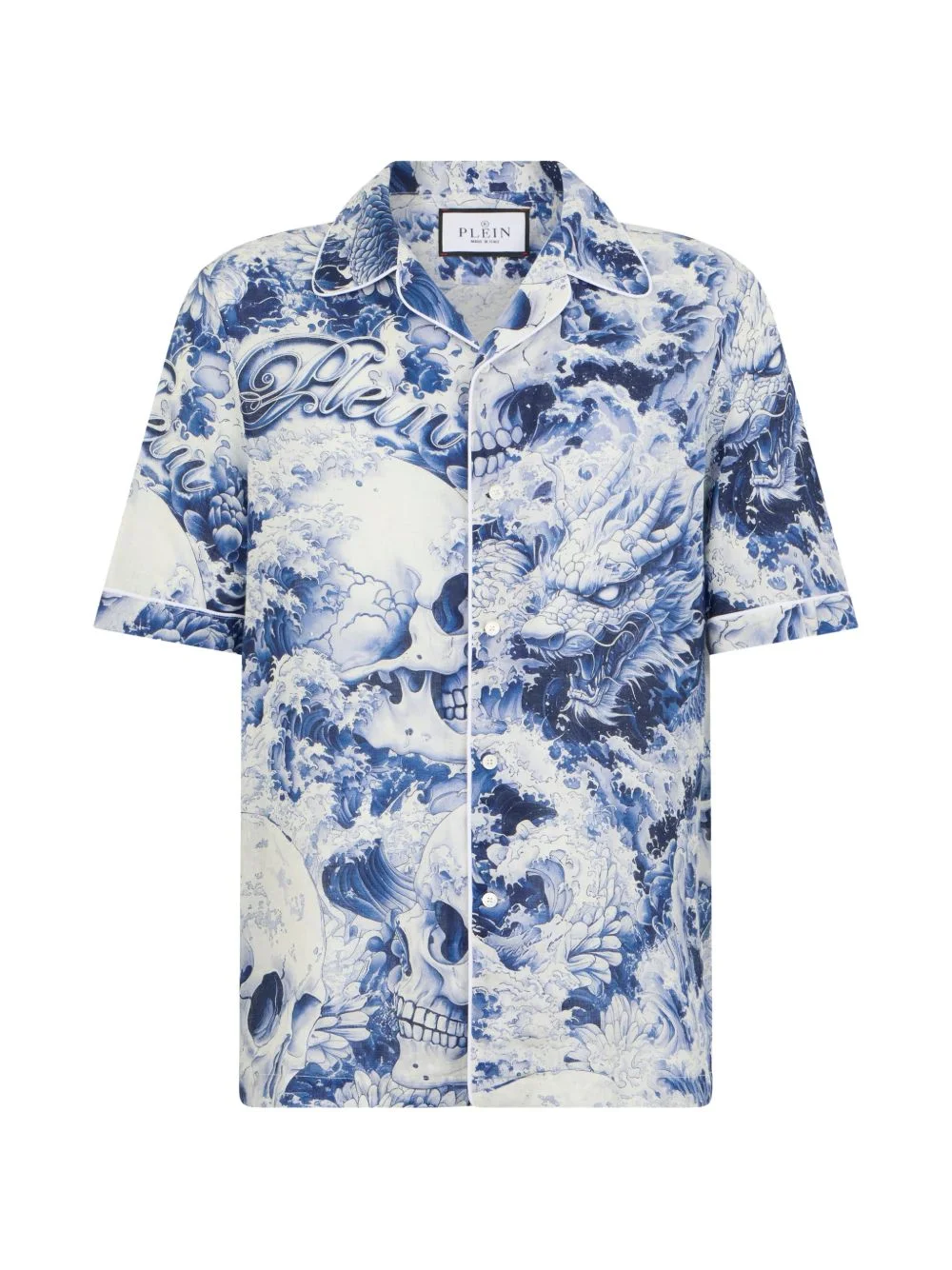 printed shirt Highlights - Navy and white - All-over print - Short sleeves - Button fastening - Contrast piping - Camp collar Made in Italy Composition Linen/Flax 55%, Cotton 45% Washing instructions Read Manufacturer Guidelines