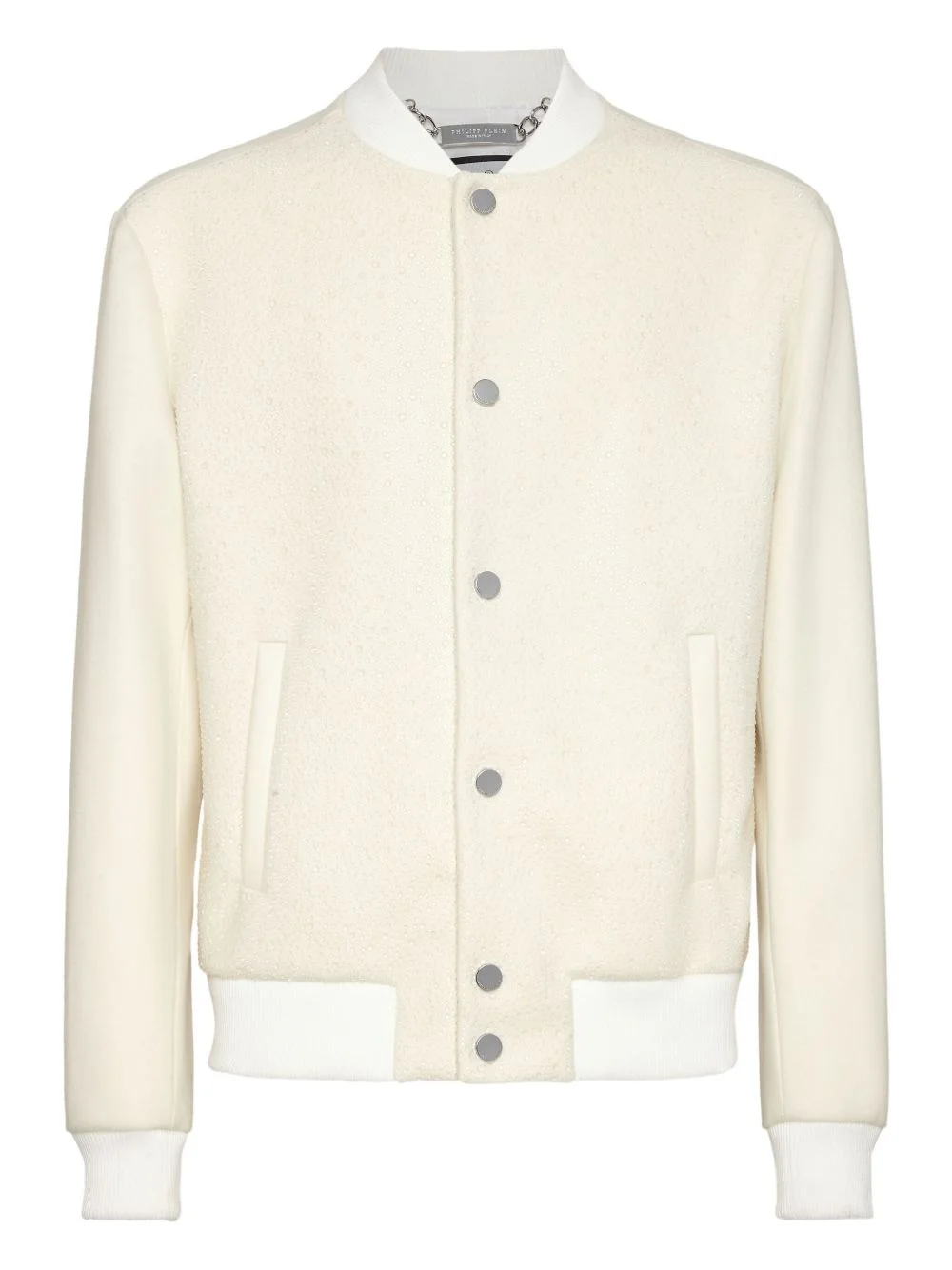 rhinestone-embellished bomber jacket Highlights - Light beige - Front press-stud fastening - Two side welt pockets - Baseball collar - Long sleeves Made in Italy Composition Outer: glass 100%, Wool 70%, Polyamide 20%, Cashmere 10% Lining: Viscose 51%, Acetate 49%