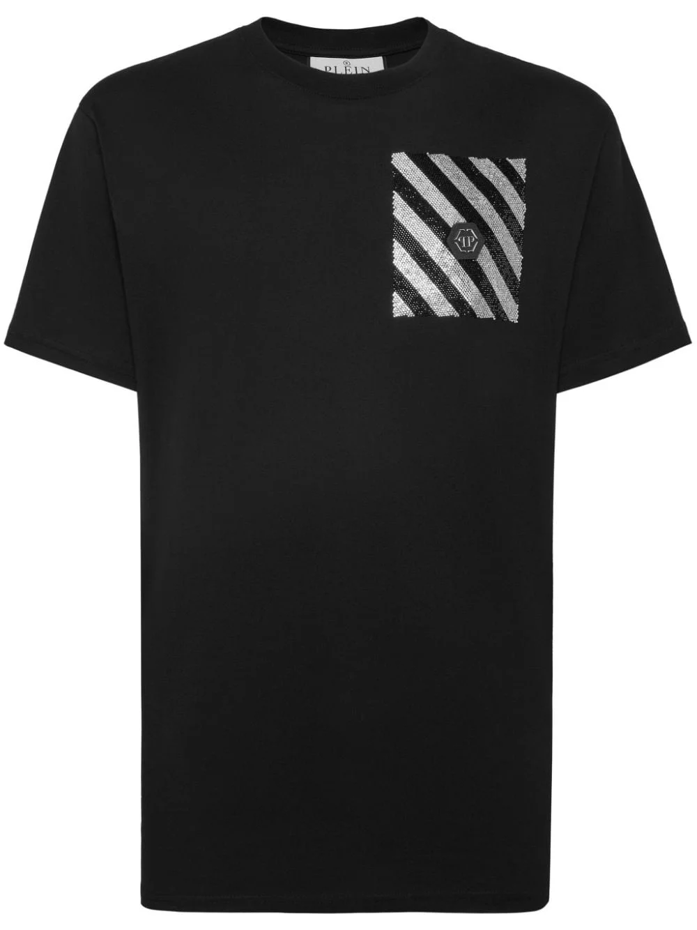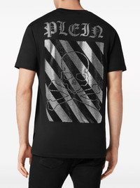 rhinestone-embellished striped T-shirt Highlights - Black/silver-tone - Cotton - Jersey texture - Diagonal stripe pattern - Skull print to the rear - Rhinestone embellishment - Applique logo - Crew neck - Short sleeves - Straight hem Imported Composition Cotton 100%