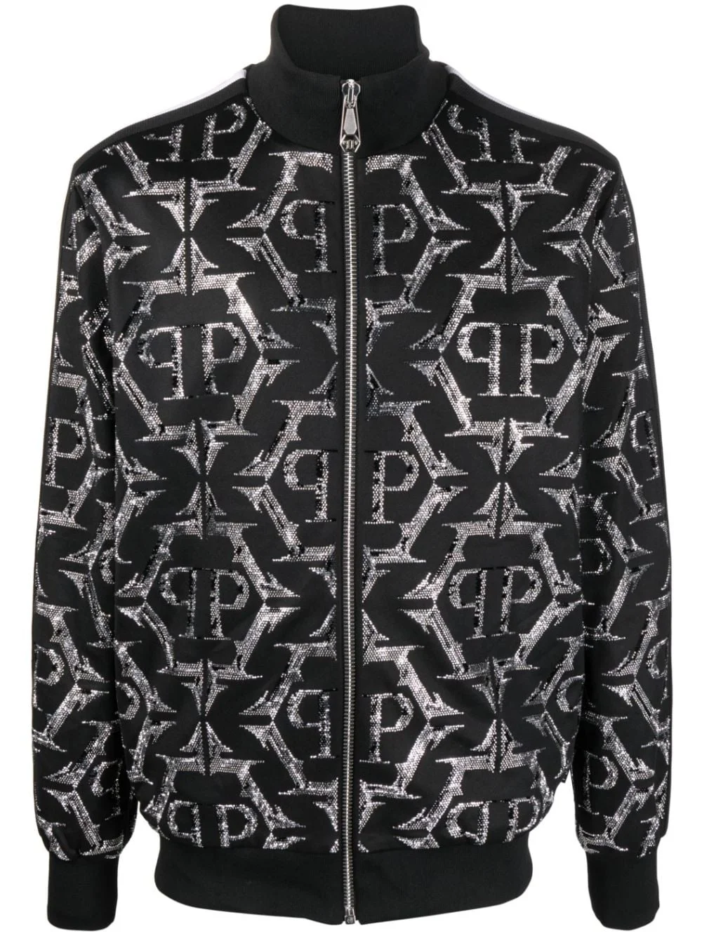 rhinestone-embellished zip-up jacket Highlights - Black - Applique logo - Rhinestone embellishment - Side stripe detailing - High neck - Front zip fastening - Long sleeves - Ribbed cuffs and hem - Straight hem Imported Composition Polyester 95%, Spandex/Elastane 5% SIZE & FIT Model measurements Height 6 ft 2 in(1.89 m) Bust/Chest 38.97 in(99 cm) Hips 38.18 in(97 cm) Waist 32.28 in(82 cm) FittingInformation Designed for a slim fit, offering a comfortable fit that sits just away from the body The ribbed hem offers a close, comfortable fit Made from a heavyweight stretch fabric, this piece offers elasticity and flexibility when worn This piece fits true to size – take your usual size Washing instructions Hand Wash