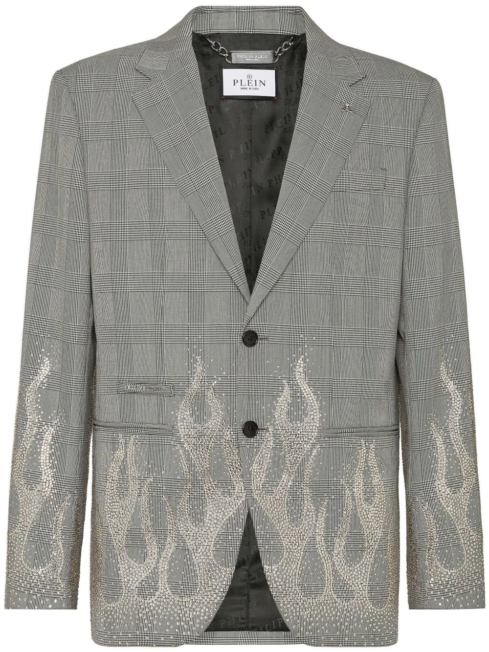 rhinestone-flame embellished blazer Highlights - Grey - Prince of wales check pattern - Front button fastening - Two front welt pockets - Buttoned cuffs Made in Italy Composition Outer: glass 100%, Polyester 68%, Viscose 30%, Elastane 2% Lining: Viscose 51%, Acetate 49%
