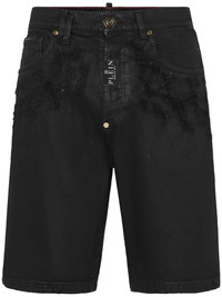 ripped-detail denim shorts Highlights - Black - Cotton - Denim - Distressed effect - Ripped detailing - Applique logo - Gold-tone logo plaque - Mid-rise - Concealed fly and button fastening - Belt loops - Straight leg - Classic five pockets - Above-knee length Made in Italy Composition Cotton 100%