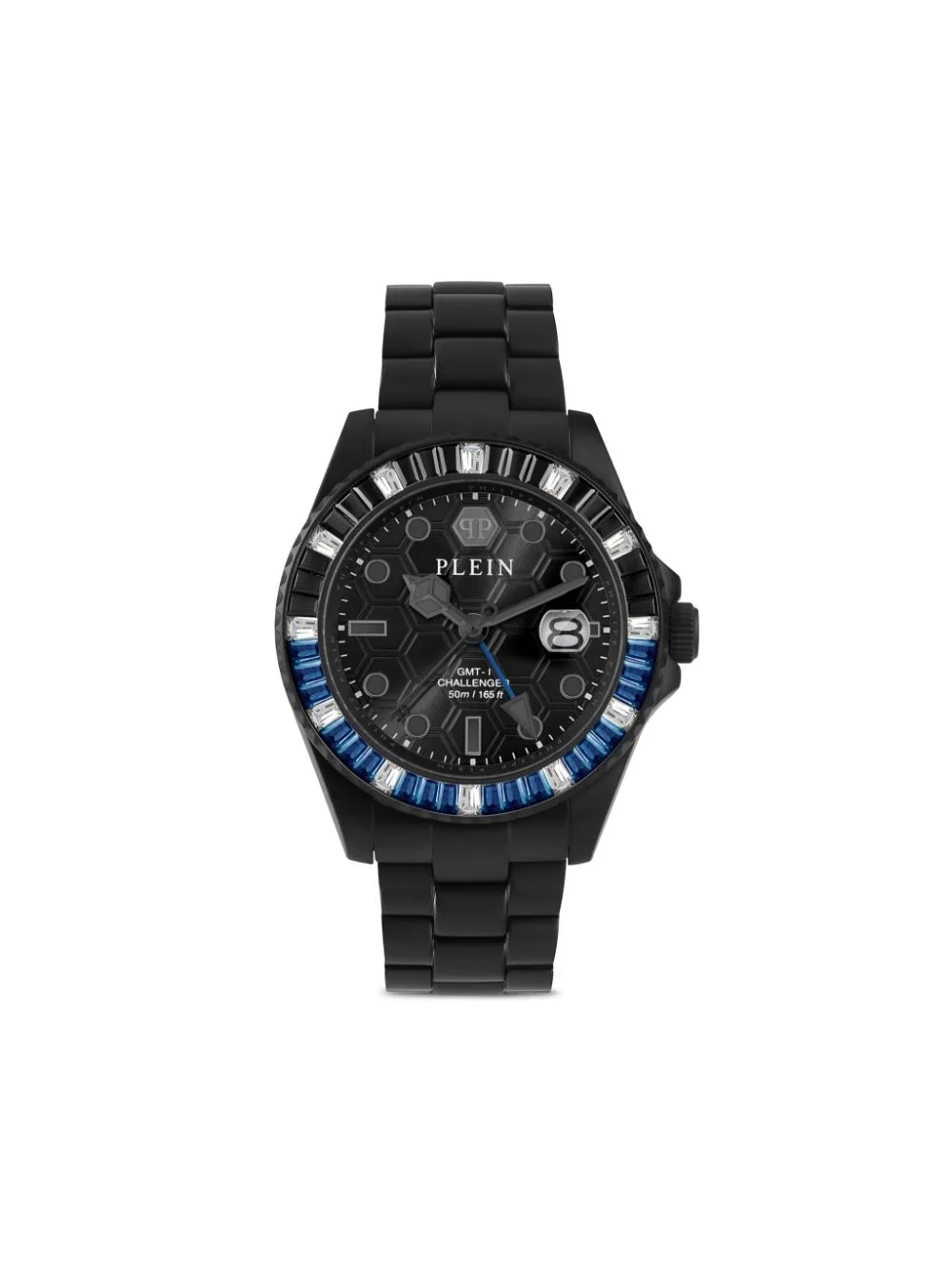 GMT-I Challenger Baguettes 44mm Highlights - 38mm - Black - Round face - Guilloche dial - Geometric dial - Arrow hands - Screw-down crown - Crystal-encrusted bezel - Stainless steel case - Crystal embellishment - Stainless steel link bracelet - Clasp fastening - Day-date display - Water resistance up to 50m/5 atm - This item comes with a standard two-year warranty from the brand. Imported Composition stainless steel 100%, glass 100%