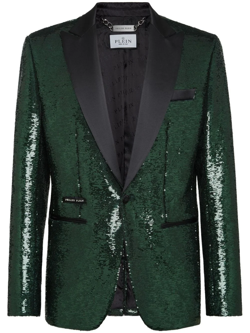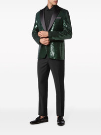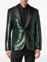 sequin-design single-breasted blazer Philipp Plein's statement-making aesthetic is on full display with this blazer. Cut to a classic single-breasted silhouette, it is defined by a dark green sequin design and boasts contrasting peak lapels for a sophisticated finish. Highlights - Dark green - Sequin design - Peak lapels - Chest welt pocket - Long sleeves - Logo tag - Two side welt pockets - Straight hem Made in Italy Composition Polyester 95%, Spandex/Elastane 5% Washing instructions Read Manufacturer Guidelines