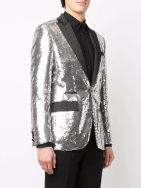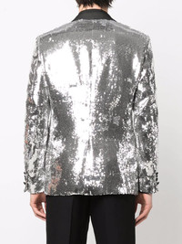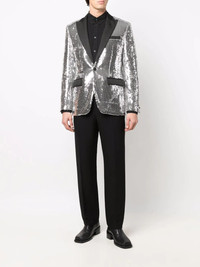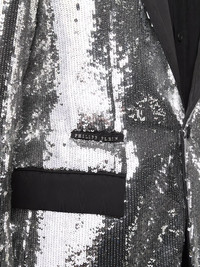 sequin-embellished single-breasted blazer silver/black sequin embellishment two side flap pockets front button fastening notched lapels long sleeves buttoned cuffs curved hem Made in Italy Composition Outer: Polyester 100% Lining: Viscose 51%, Acetate 49% SIZE & FIT Model measurements Height 6 ft 2 in(1.89 m) Bust/Chest 37.79 in(96 cm) Hips 37 in(94 cm) Waist 29.92 in(76 cm) Washing instructions Dry Clean Only