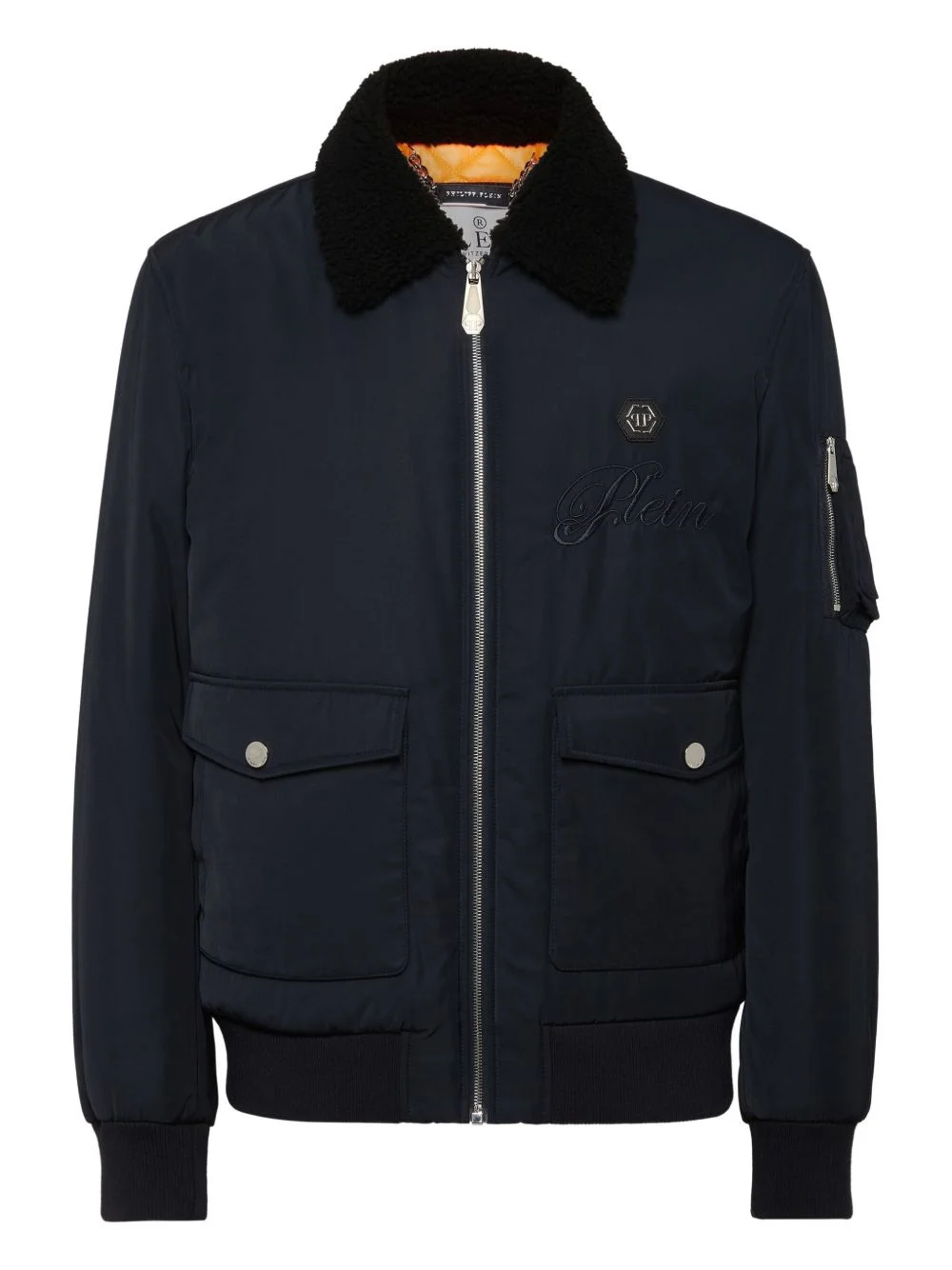shearling-collar bomber jacket Highlights - Dark blue - Faux-shearling collar - Embroidered logo - Zip fastening - Side flap pockets - Ribbed cuffs Imported Composition Polyester 100% Washing instructions Read Manufacturer Guidelines