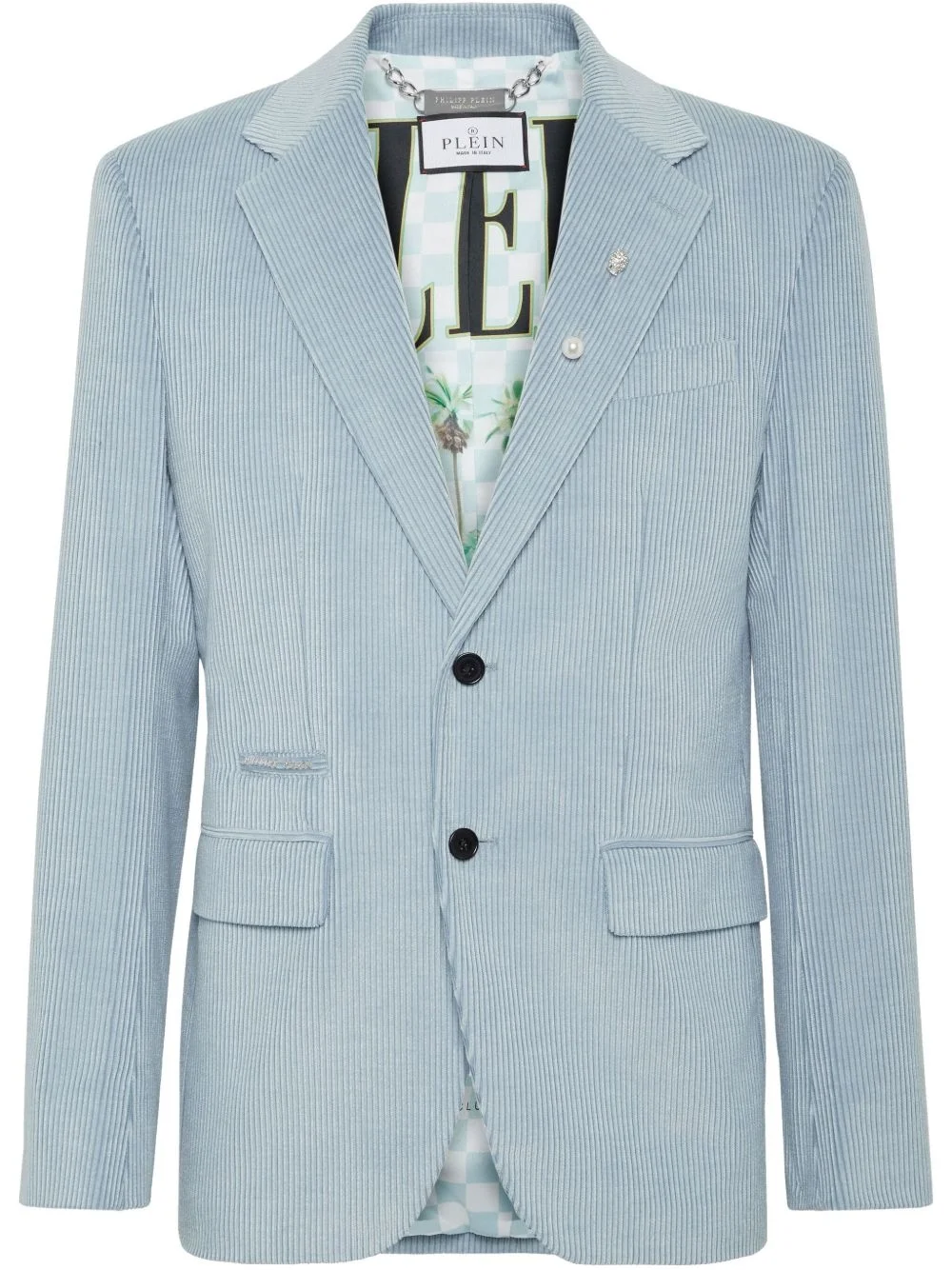 single-breasted blazer Highlights - Light blue - Front button fastening - Two side flap pockets - Buttoned cuffs - Faux-pearl detailing Made in Italy Composition Outer: Cotton 100% Lining: Polyester 100%