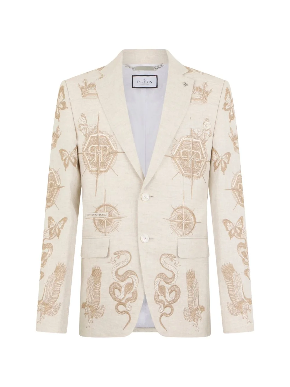 single-breasted buttoned blazer Highlights - Beige - All-over graphic print - Single-breasted - Two front pockets - Peak lapels - Two-button fastening Made in Italy Composition Outer: Linen/Flax 100%, Polyester 100% Lining: Viscose 51%, Acetate 49% Washing instructions Read Manufacturer Guidelines