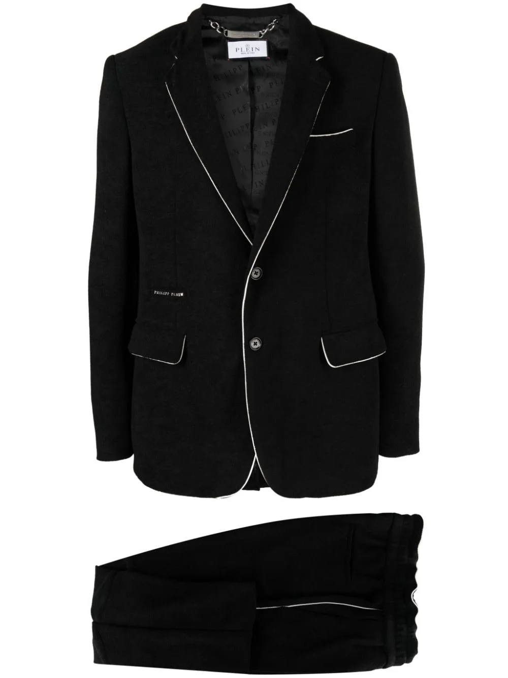 single-breasted chenille suit Highlights - Black/white - Velvet - Chenille texture - Piped-trim detailing - Jacket: - Silver-tone logo lettering - Logo patch to the rear - Notched lapels - Front button fastening - Long sleeves - Buttoned cuffs - Jetted chest pocket - Two front flap pockets - Trousers: - Logo patch to the front - Elasticated drawstring waistband - Two side inset pockets - Two rear welt pockets - Ribbed ankles Made in Italy Composition Lining: Polyester 65%, Viscose 51%, Acetate 49%, Cotton 35% Outer: Polyester 86%, Polyamide 14% SIZE & FIT Model measurements Height 6 ft 2 in(1.87 m) Bust/Chest 36.41 in(92.5 cm) Hips 37 in(94 cm) Waist 29.52 in(75 cm) FittingInformation Tailored for a slim fit, offering a comfortable fit that sits just away from the body Made from a midweight non-stretch fabric, this piece offers minimal elasticity when worn This piece fits true to size – take your usual size Washing instructions Dry Clean Only
