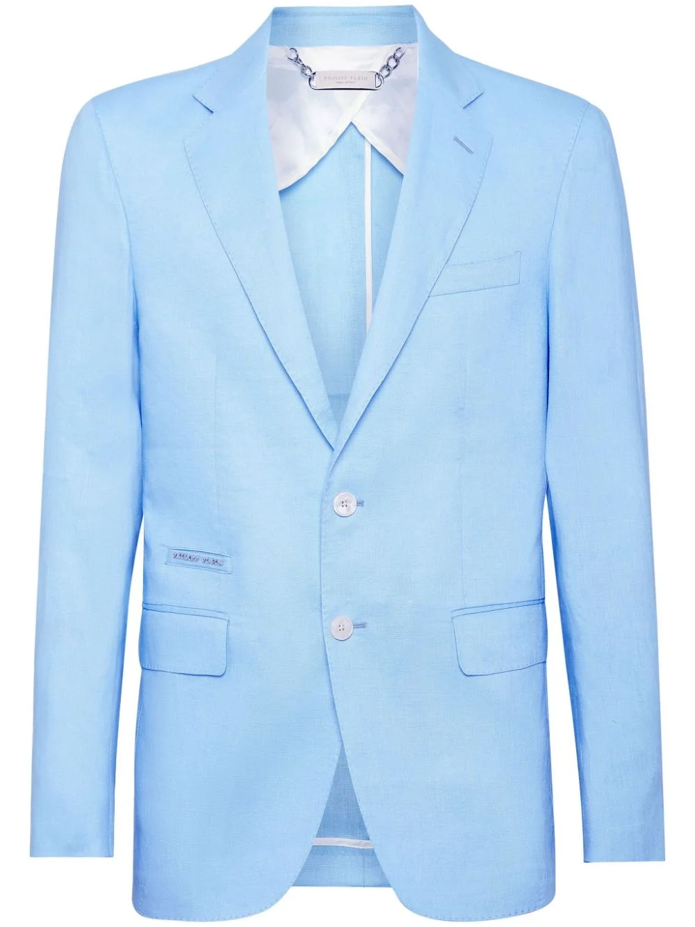 single-breasted linen blazer Highlights - Light blue - Linen/flax - Applique logo - Notched lapels - Front button fastening - Long sleeves - Buttoned cuffs - Jetted chest pocket - Two front flap pockets - English rear vents - Unlined Made in Italy Composition Lining: Viscose 51%, Acetate 49% Outer: Linen/Flax 100% Washing instructions Read Manufacturer Guidelines