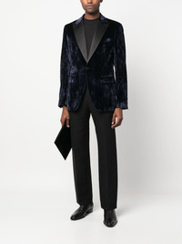 single-breasted velvet blazer midnight blue velvet logo patch to the side classic lapels front button fastening chest welt pocket two side flap pockets long sleeves Made in Italy Composition Outer: Polyester 100%, Viscose 80%, Silk 20% Lining: Acetate 60%, Viscose 40% SIZE & FIT Model measurements Height 6 ft 2 in(1.88 m) Bust/Chest 36.61 in(93 cm) Hips 35.82 in(91 cm) Waist 27.95 in(71 cm)
