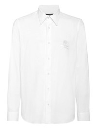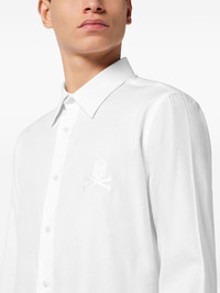 skull-embroidered button-up shirt Highlights - White - Straight-point collar - Button fastening - Embroidered skull and crossbones - Long sleeves - Curved hem Made in Italy Composition Cotton 100%