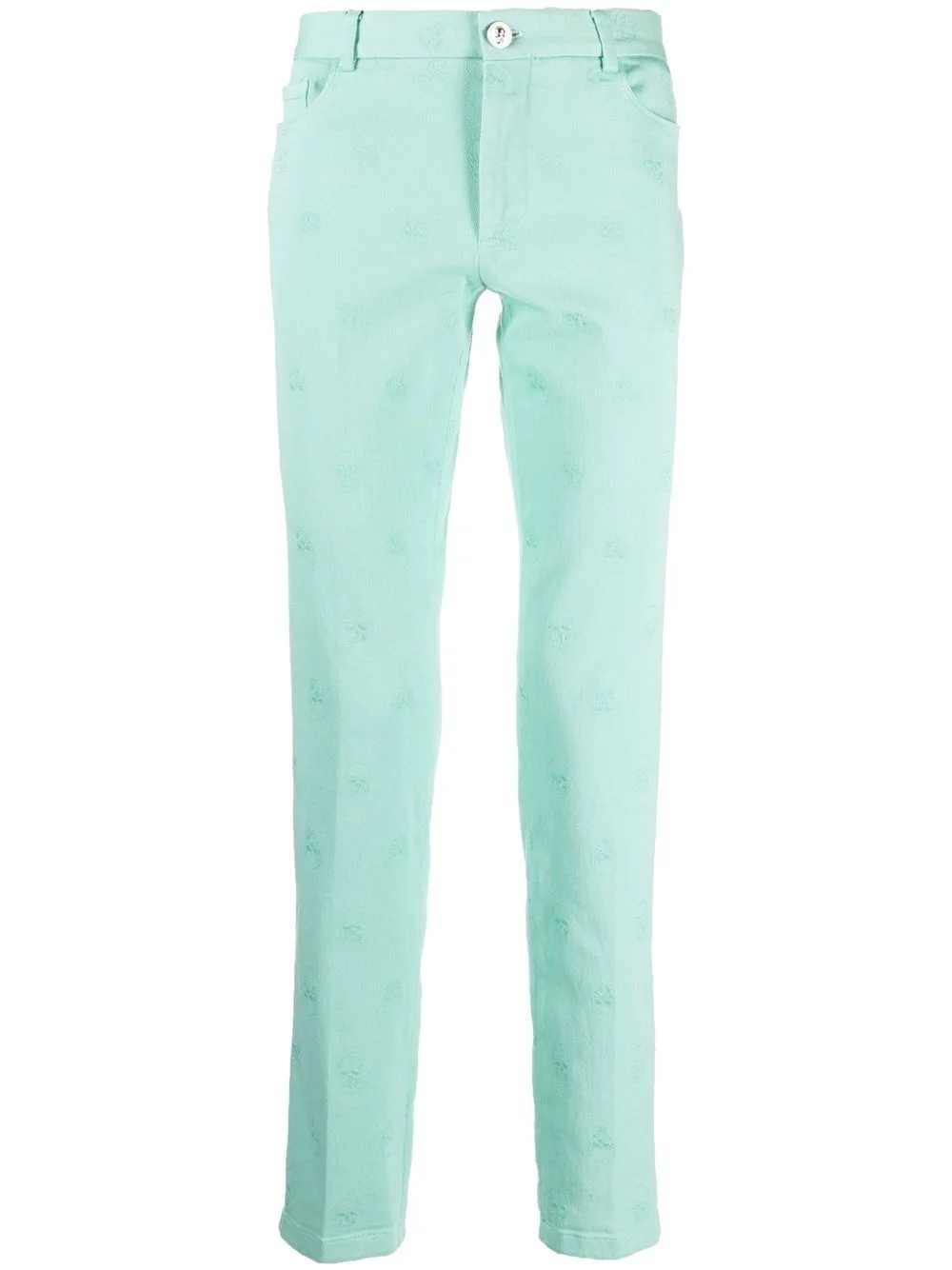 skull embroidery straight-leg trousers Highlights - Light blue - Cotton blend - Embroidered motif - Mid-rise - Concealed front fastening - Belt loops - Classic five pockets - Straight leg Made in Italy Composition Outer: Cotton 97%, Elastane 3% Lining: Polyester 65%, Cotton 35% SIZE & FIT Model measurements Height 6 ft 1 in(1.86 m) Bust/Chest 35.43 in(90 cm) Hips 36.61 in(93 cm) Waist 29.52 in(75 cm) FittingInformation This piece fits true to size. We recommend you get your regular size Cut for a slim fit Made with a mid-weight stretch fabric Washing instructions Dry Clean Only