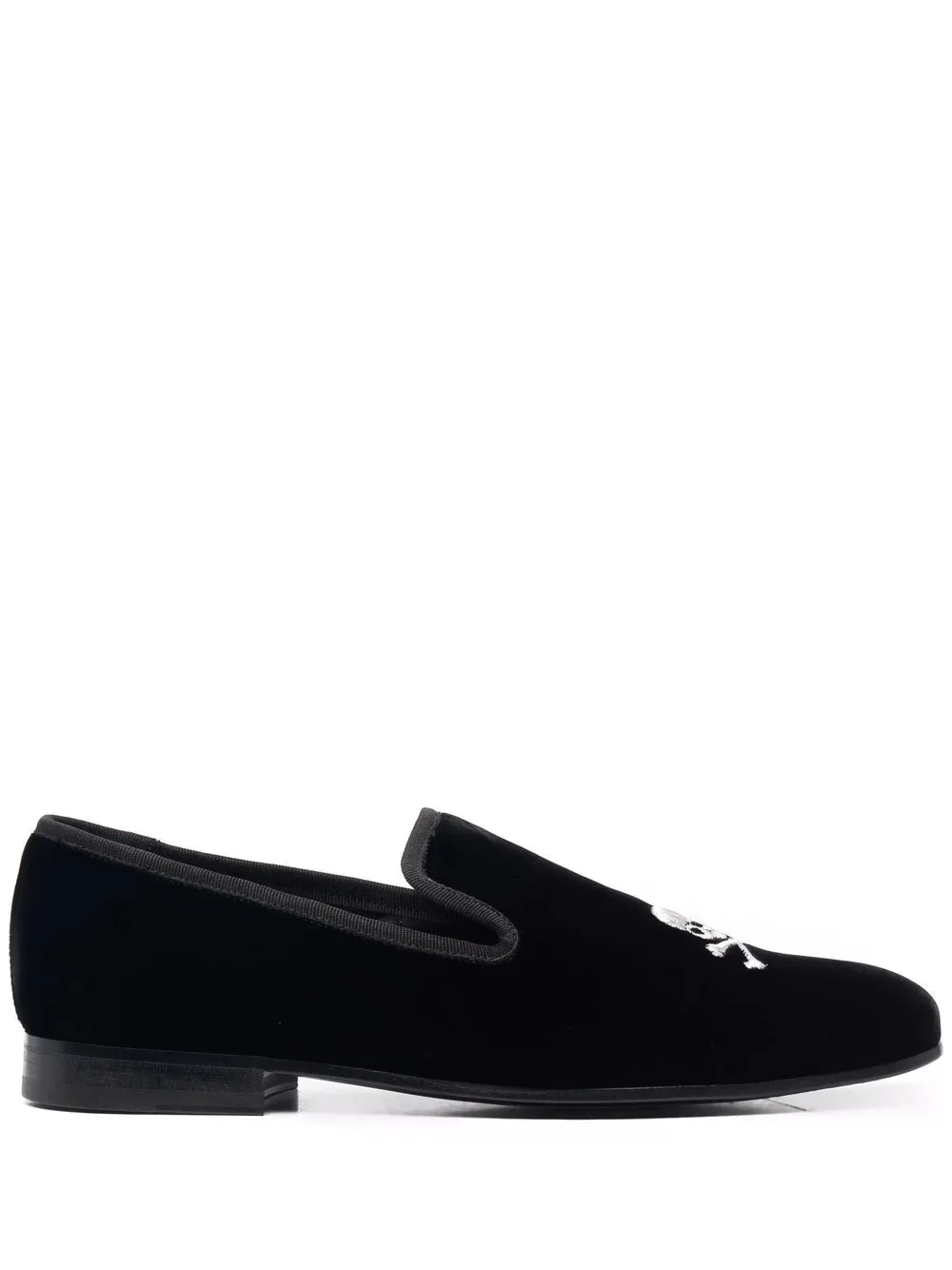 skull embroidery velvet loafers black leather square toe slip-on style branded insole flat sole Made in Italy Composition Sole: Leather 100% Outer: Viscose 65%, Cupro 35% Lining: Viscose 65%, Cupro 35% SIZE & FIT Measurement HEEL 1.18 in(3 cm)