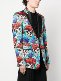 skull-print blazer blue/ multicolour skull print peak lapels contrasting lapels internal logo plaque front button fastening two side flap pockets long sleeves satin lining Made in Italy Composition Polyester 60%, Cotton 37%, Spandex/Elastane 3% Outer: Polyester 100% Lining: Polyester 100% SIZE & FIT Model measurements Height 6 ft 1 in(1.86 m) Bust/Chest 34.64 in(88 cm) Hips 35.43 in(90 cm) Waist 27.55 in(70 cm) FittingInformation This piece fits true to size. We recommend you get your regular size Cut for a relaxed fit Made with a mid-weight fabric
