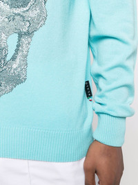 Skull print crewneck sweater celeste blue skull print to the front rhinestone embellishment crew neck long sleeves straight hem ribbed trim Made in Italy Composition Fabric 100%, Crystal 100% SIZE & FIT Model measurements Height 6 ft 1 in(1.85 m) Bust/Chest 38.58 in(98 cm) Hips 37 in(94 cm) Waist 30.31 in(77 cm) Washing instructions Dry Clean Only