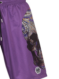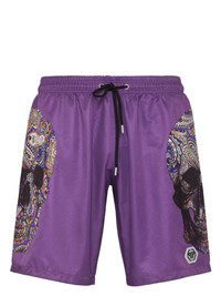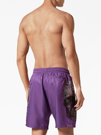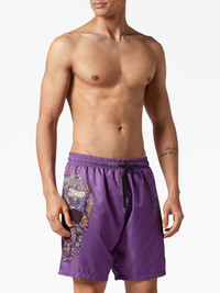 skull-print drawstring swim shorts Highlights - Grape purple - Skull print - Logo patch to the front - Elasticated drawstring waistband - Two side slit pockets - Rear welt pocket - Straight hem - Above-knee length - Be mindful to try on swimwear over your own garments. Imported Composition Polyester 100%