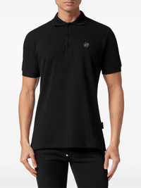 skull-print rhinestone-embellished polo shirt Highlights - Black/white - Cotton - Pique weave - Skull print - Rhinestone embellishment - Applique logo - Polo collar - Front button placket - Short sleeves - Straight hem Imported Composition Cotton 100%, Glass Fiber 100%