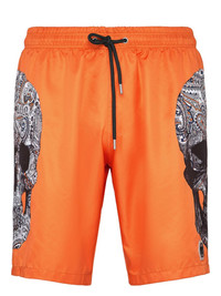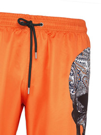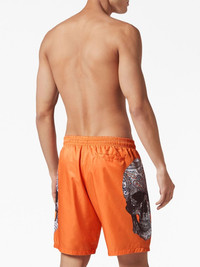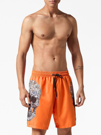 skull-print swim shorts Highlights - Carrot orange - Skull print - Logo patch to the front - Elasticated drawstring waistband - Two side slit pockets - Rear welt pocket - Straight hem - Be mindful to try on swimwear over your own garments. Imported Composition Polyester 100%